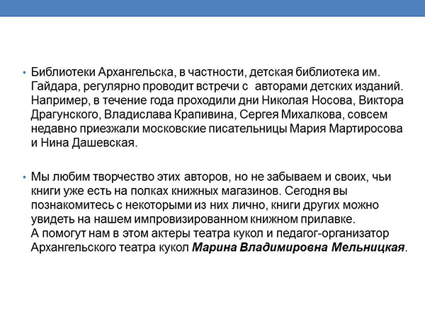 12 декабря в Детской библиотеке им. Гайдара директор издательства "Лоция" Тамара Овчинникова и актеры Архангельского театра кукол рассказали про детские книги архангельских авторов.