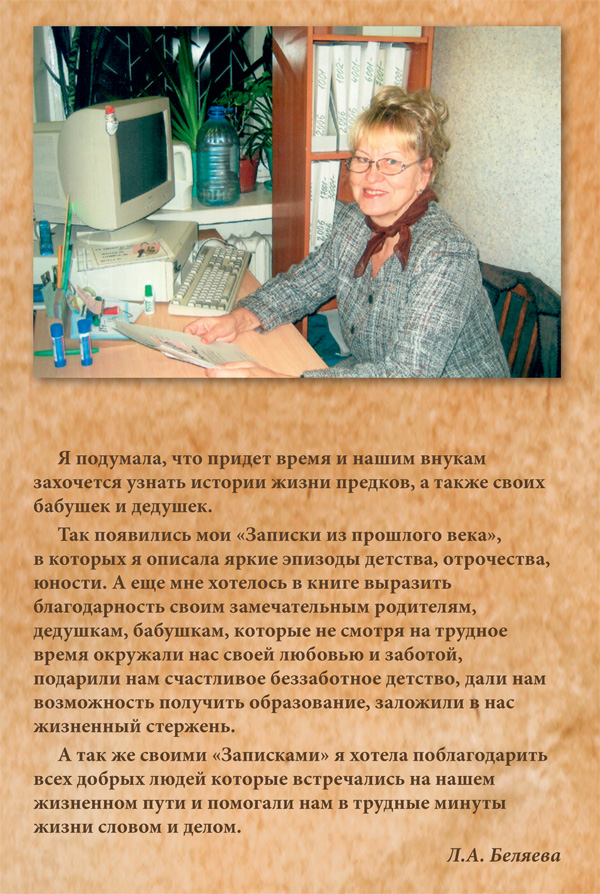 Иногда нам в издательство приходят с рукописями не для большой аудитории, а для "своих": детей, внуков, друзей. Обычно это малотиражки, 20-30 экземпляров, но и таким книгам мы посвящаем много времени и труда. Так, недавно в свет вышла книга очерков Людмилы Беляевой "Записки из прошлого века", в которой автор сохранила истории жизни предков для своих внуков.
