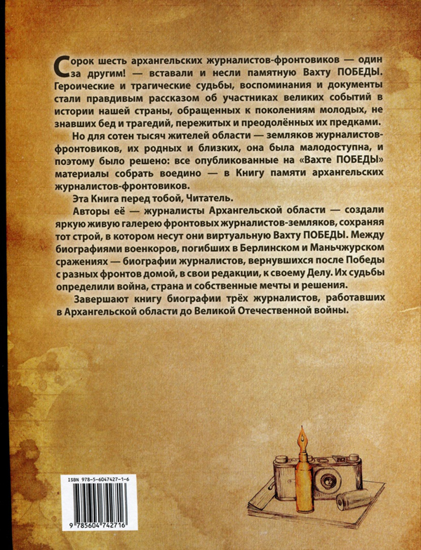 Кто-то представляет легендарных военкоров – тех, кто прошел фронтовыми дорогами, тропами и бездорожьем «с лейкой и блокнотом, а то и с пулеметом», как Калестин Коробицын и Александр Семаков. Другие выбрали Слово своим оружием и инструментом уже после Победы. Но каждый исполнил долг воина и внес свой вклад в историю архангельской, а то и российской журналистики. Представлены в книге и те, кто оставил след в художественной литературе, например Юрий Герман, Николай Жернаков, Евгений Коковин.