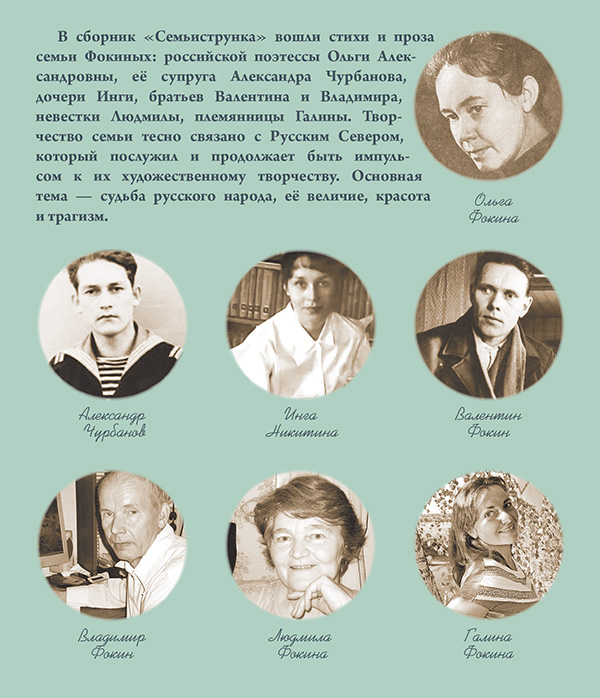 Идея сборника «Семьиструнка» родилась в тот момент, когда к читателям пришла новая книга О.Фокиной «Под березой…» (Архангельск, САФУ, 2011). Представляли мы её на III Фокинском литературно- музыкальном фестивале в Верхней Тойме. Тогда подумалось: «А не собрать ли под одной обложкой всех писавших и пишущих представителей большой семьи Фокиных?» Но, как часто бывает, от появления идеи до её воплощения – в нашем случае издания книги – прошло немало времени: восемь лет. С благодарностью вспоминаю встречи с Фокиными, на которых обсуждалась будущая книга, их доброжелательность и поддержку, готовность помочь и доверие к свершаемому составителем выбору…Название сборнику подарила Ольга Александровна Фокина.